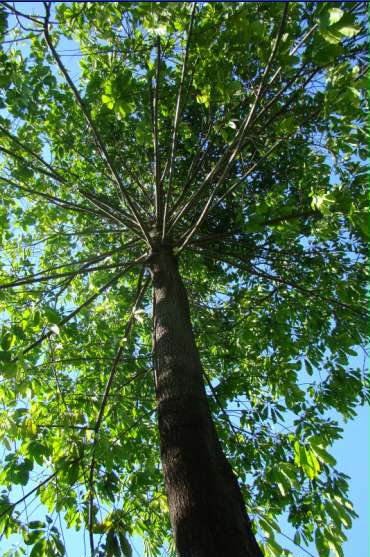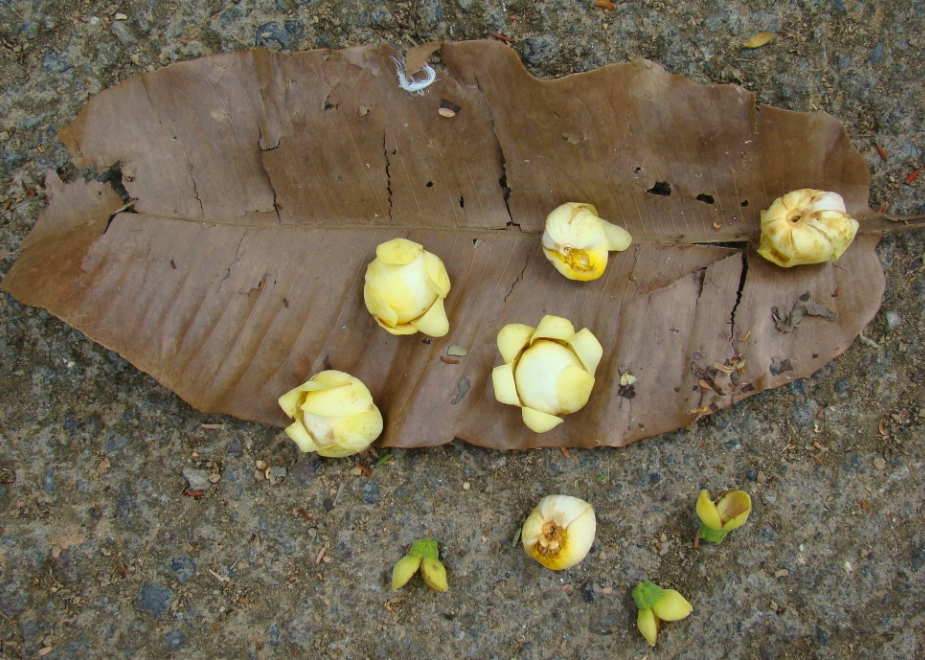 | Características: Árvore de grande porte, este exemplar tem 13 metros de altura. Folhas largas e lisas, nervuras marcada, levemente avermelhadas quando novas. Flor grande, amarela quase branca. Fruto muito duro, redondo, 12 cm de diâmetro. quando quebrado expõe dezenas de sementes também envoltas por casca muito dura. A germinação é difícil e muito demorada. | ||