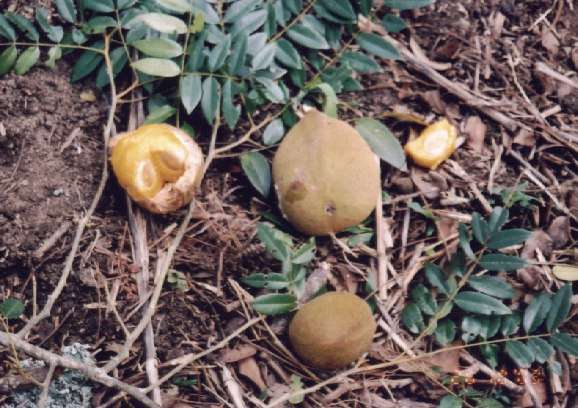 Esta é uma swartzia, porém não sabemos ao certo o tipo. Não a encontrei bem no cerrado, mas em região de transição com Mata Atlântica, no Vale do Jequitinhonha. Por aqui temos algumas swartzia, mas esta é bem diferente, com frutos na ponta dos galhos, e não no tronco, frutos grandes, redondos e com o cabo curto. Na região é chamada de Banha de galinha, devido à semelhança que apresenta no arilo que envolve as sementes.