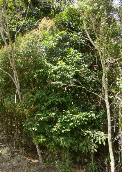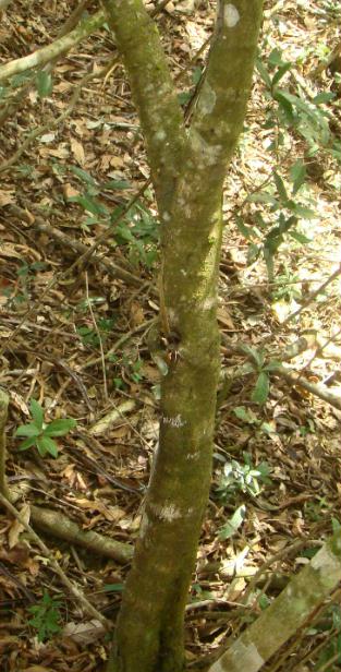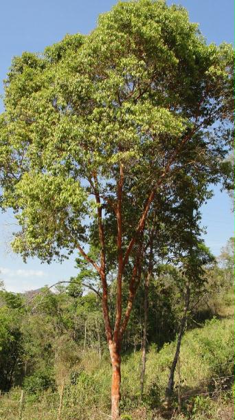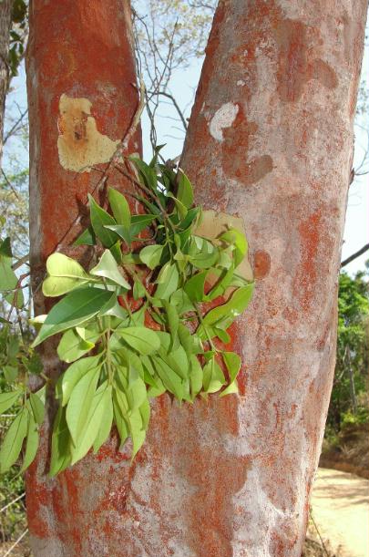 5- Uma MYRTACEAE com tronco vermelho Segundo o Marco Lacerda, uma Eugenia candolleana (familia Myrtaceae). Não vi flor ou fruto. É comum nas matas de lá e o que me chamou a atenção foi a cor do tronco.