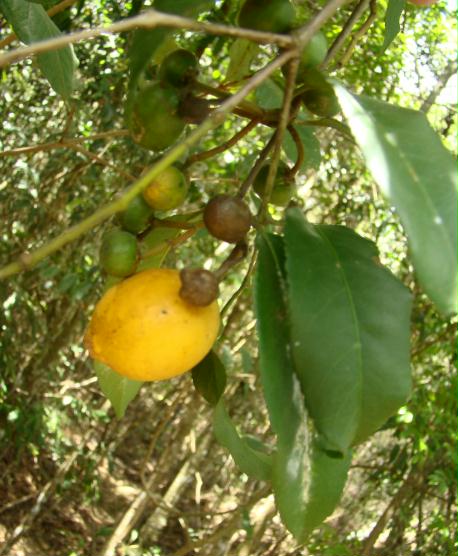 MATO ou GUAMIRIM Provavelmente Eugenia gardneriana (nome popular Guamirim) - Myrtaceae. Livro "Árvores brasileiras" Volume 2. Pouca polpa de sabor doce e adstringente. Conforme Marco Lacerda (co-autor do livro "Frutas do Brasil") o nome cientifico atual seria Eugenia punicifolia.