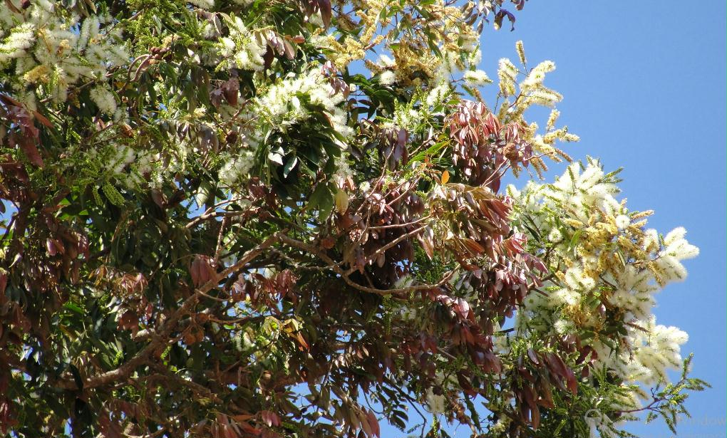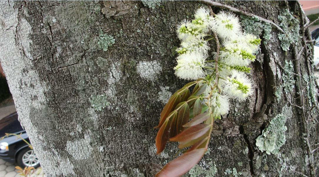 6- Um Ingá diferente, de grande porte Provavelmente um Inga, parecido com o Inga lancifolia. Familia Leguminosae-Mimosoideae, Floração muito bonita. De longe o tronco parece liso e branco.