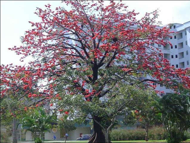 Árvore muito utilizada no paisagismo urbano devido sua beleza, em julho fica totalmente coberta de flores de vermelho vivo. É uma espécie exótica, nativa da Índia, porém muito disseminada por aqui.