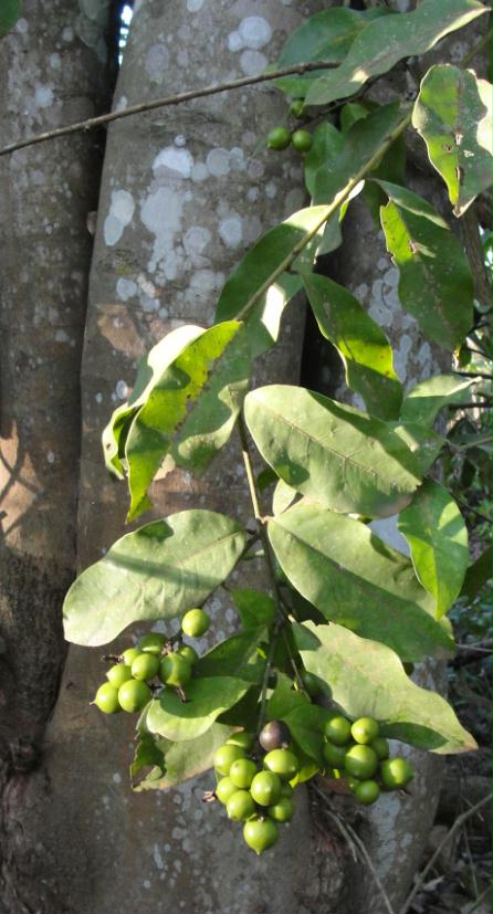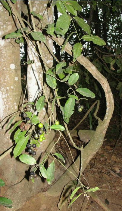 | Características: Não se trata de árvore, e sim de cipó. Ocorre sobre o chão, rasteiro, e mais frequentemente sobre arvores, as vezes, como na foto, ocupando todo o espaço em arvores altas, até uns 15 metros. A floração e frutificação ocorre na ponto dos ramos pendentes. o fruto fica macio e preto quando maduro. Contem polpa clara doce levemente acida, e em geral três sementes. | ||