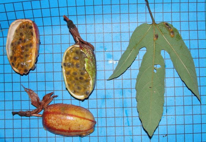 | Características: Não se trata de árvore, e sim de cipó. Ocorre sobre arvores e arbustos. Flor bem vermelha, folhas trilobadas. Fruto com desenho característico, dai o nome. Quando maduro fica verde- amarelado. Casca fina e muito dura. Polpa doce, levemente ácida, com perfume peculiar muito agradável, e diferente de outros maracujás. | ||