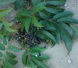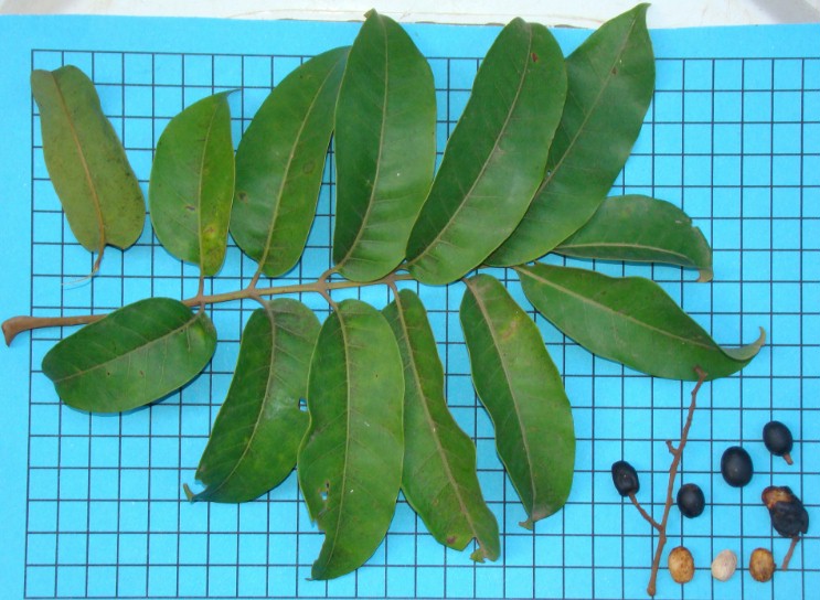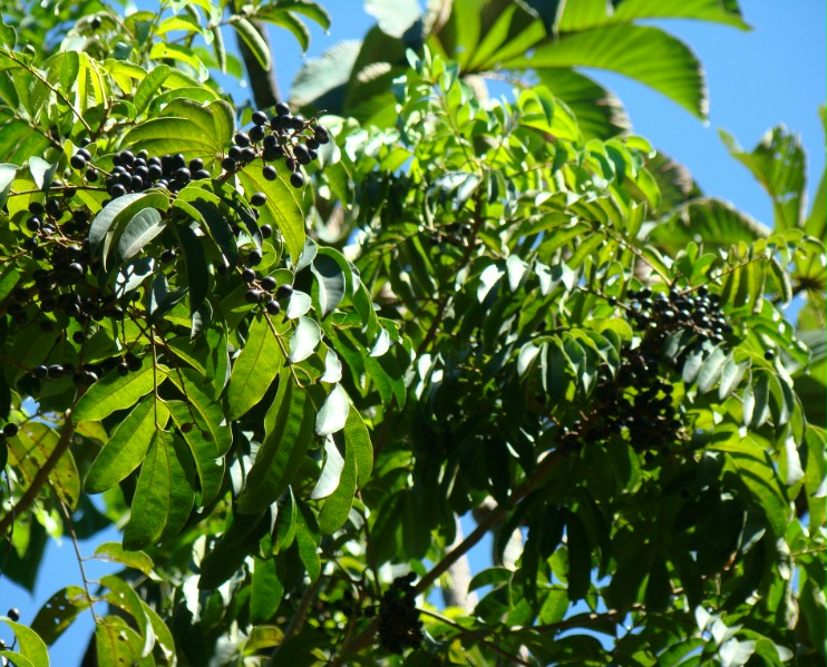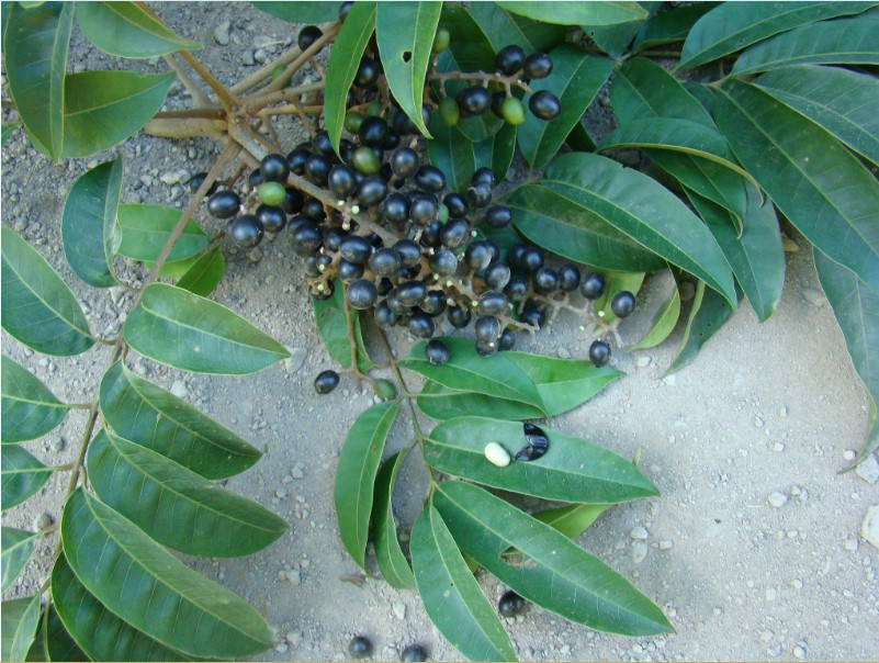 | Características: Árvore de médio porte, entre 8 e 12 metros de altura. Folhas compostas com em media 11 a 13 folíolos de 10 cm, lisos. Flores pequenas brancas, em cachos. Fruto arredondado, até 1 cm, liso, ficando preto quando maduro. Macio, a casca externa solta-se com facilidade, apresentando fina polpa branca de sabor adocicado que envolve as sementes. Sementes de 0,7 cm, de cor creme. | ||